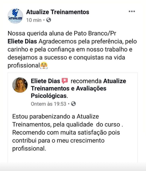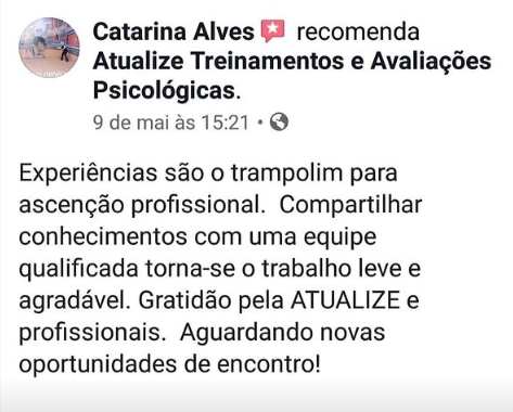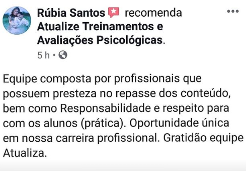 Em 2015, fundou a Atualize Treinamentos com o objetivo de promover e desmistificar a Avaliação Psicológica, auxiliando milhares de psicólogos com ou sem experiência a Viverem da Psicologia atuando com Avaliações Psicológicas.
